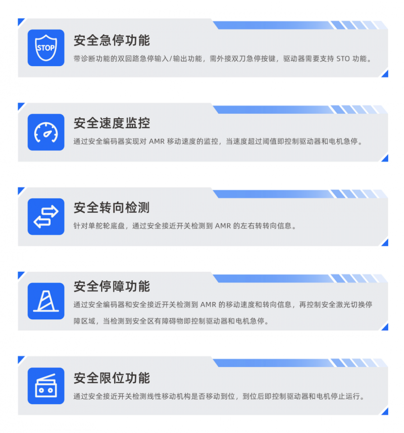 這就意味著通過 SRC-3000FS,無需安全“PLC”,即可搭建滿足 ISO 3691-4 國際安全標(biāo)準(zhǔn)的 AMR!由 SRC- 3000FS 打造的 AMR 性能強悍的同時空間更加緊湊,這不僅降低造 AMR 的難度,還能為客戶提供更多樣的造車選擇,為國產(chǎn) AMR 提供強有力的技術(shù)支持,促進 AMR 行業(yè)繁榮發(fā)展!