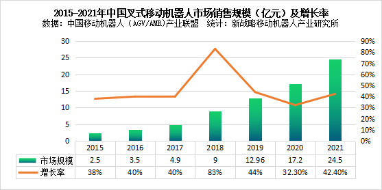圖表:2015-2021年中國(guó)叉式移動(dòng)機(jī)器人市場(chǎng)銷售規(guī)模(億元)及增長(zhǎng)率