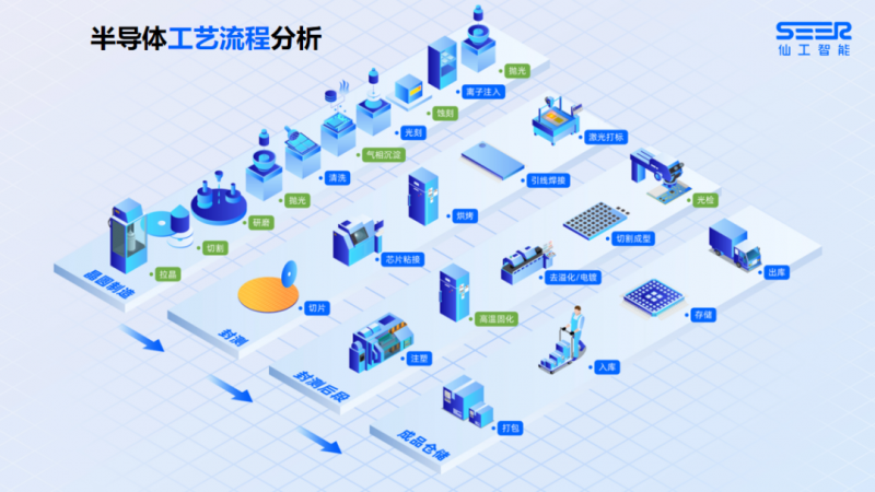 上圖為半導體整個工藝流程,圖表中清晰標注了仙工智能在整個半導體生產制程中能做的工作,包括清洗、光刻、離子注入、封測整個環節、除高溫固化和光檢以外的封測后段環節、成品倉儲整個環節,上述環節均使用仙工智能自有的解決方案。