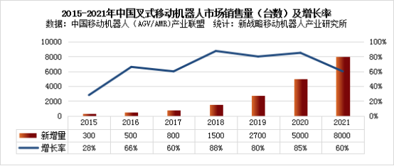 據中國移動機器人(AGV/AMR)產業(yè)聯盟數據、新戰(zhàn)略移動機器人產業(yè)研究所統(tǒng)計,2021年中國叉式移動機器人(含視覺導航)銷量達8000臺,同比增長60%,市場規(guī)模約為24.5億元,同比增長42.40%。