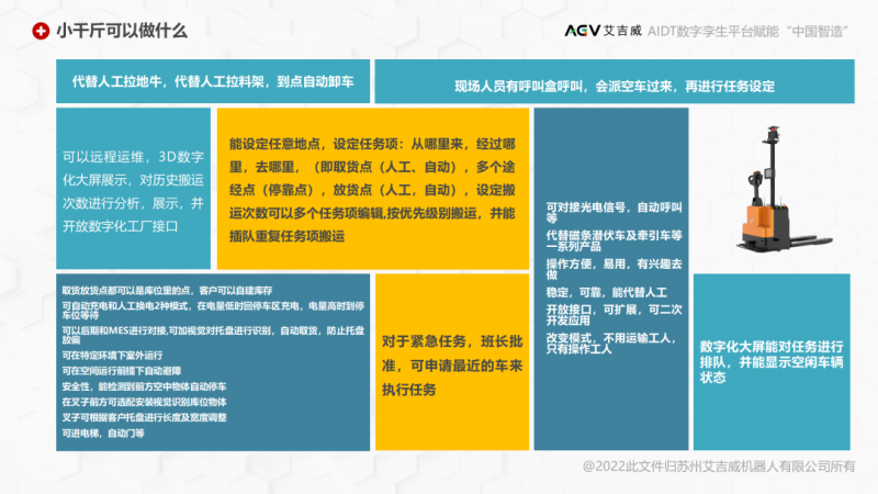 艾吉威機器人“小千斤”AGV,其設(shè)計特點手自一體多種模式,適用于物料多、載具不統(tǒng)一、配送作業(yè)繁忙、廠區(qū)面積大、配送距離遠(yuǎn)、物料員作業(yè)方式不統(tǒng)一的制造型企業(yè)。數(shù)字化大平臺免費贈送,應(yīng)用不斷免費升級,更加符合當(dāng)下“數(shù)實融合”、“智改數(shù)轉(zhuǎn)”的發(fā)展大勢。“小千斤”寓意千斤重?fù)?dān)小意思,大平臺寓意大數(shù)據(jù)平臺支撐,應(yīng)用功能免費統(tǒng)一升級。