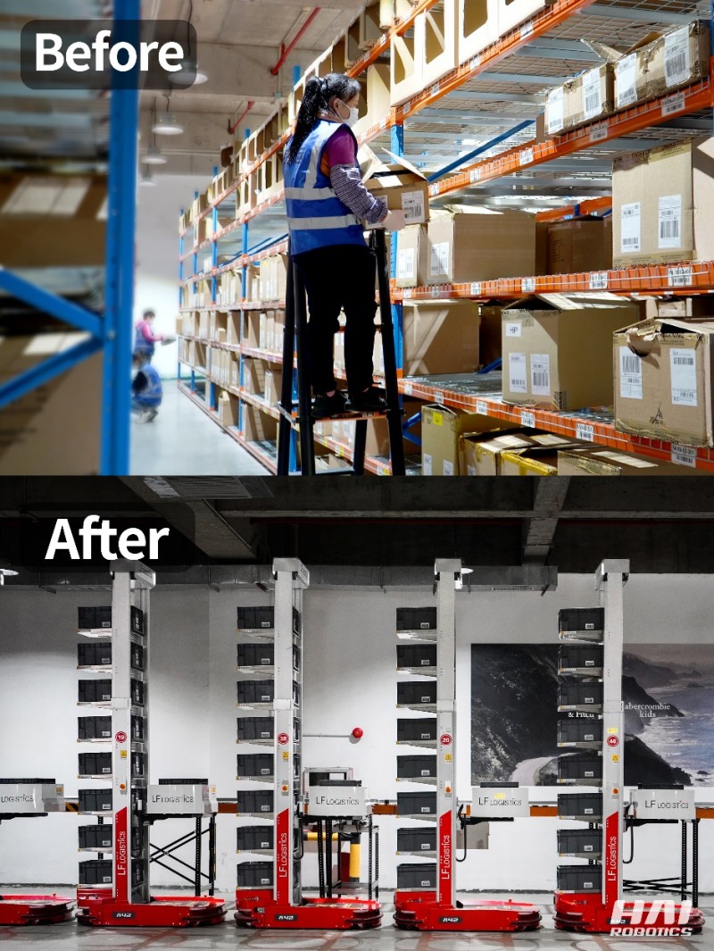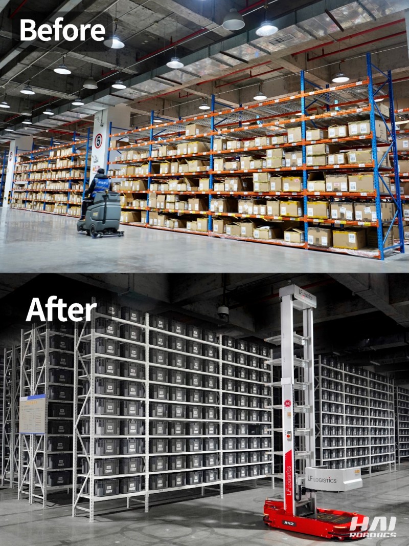 針對利豐供應(yīng)鏈倉庫存儲密度低,存儲壓力大的痛點,海柔創(chuàng)新部署HAIPICK A42箱式倉儲機器人搭配立體貨架的組合存儲方式,其中立體貨架高度可高達(dá)4.3米。此外,由于ACR的產(chǎn)品設(shè)計理念是貨箱到人,對比潛伏式移動機器人機身設(shè)計更窄,使得貨架之間的巷道面積得以進(jìn)一步縮小,從而提升存儲密度。改造后的前海