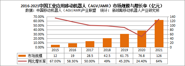 從市場規模來看,根據中國移動機器人(AGV/AMR)產業聯盟數據,新戰略移動機器人產業研究所統計、中國工業應用移動機器人銷售規模從2015年12億到2021年126億,實現了10倍增長。其中,2016年至2021年中國市場工業應用移動機器人(AGV/AMR)產業年復合增長率約46%,尤其是2021年度全球新冠疫情的大規模影響之下,同比增長高達64%,遠遠超過絕大部分行業增長速度。