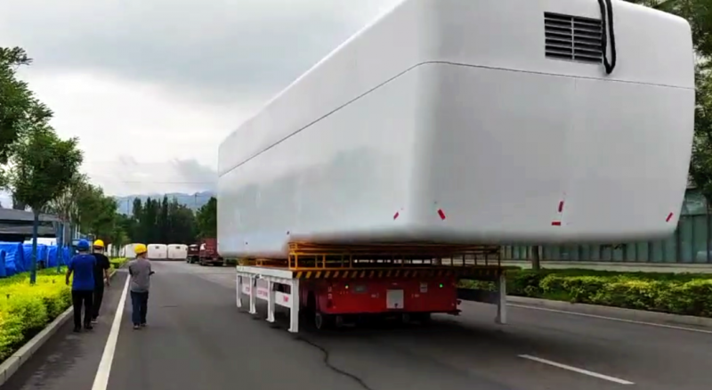 在搬運環節中,航天智造為浙江運達風電,研制的200噸全向舵輪AGV,載重量大,轉向靈活且可以全向移動不傷地面,定位精度高,操控方便,滿足客戶大型風電的運載要求。