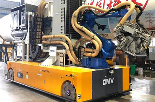 除了物料搬運外,在重載移動機器人底盤上加裝上端機械臂和其他組件,也可以讓AGV進入到生產環節,相當于是給機械臂加上了“雙腳”。如在風力發電葉片打磨領域,運用復合型AGV便可以實現葉片的全自動化打磨,其中無需人工操作,且內置的力控系統可以保證打磨時恒力接觸,從而保證了葉片的質量;同時,葉片打磨復合型AGV在打磨頭上裝備紅外線測距感應器,實時監控,有效確保了打磨精度。風電行業中的復合型重載AGV,除了可以適應葉片打磨的工作,稍加改裝,還可以應用于葉片根部雙頭螺栓的安裝與檢測等安裝工作,進一步取代人工,提升企業know-how。