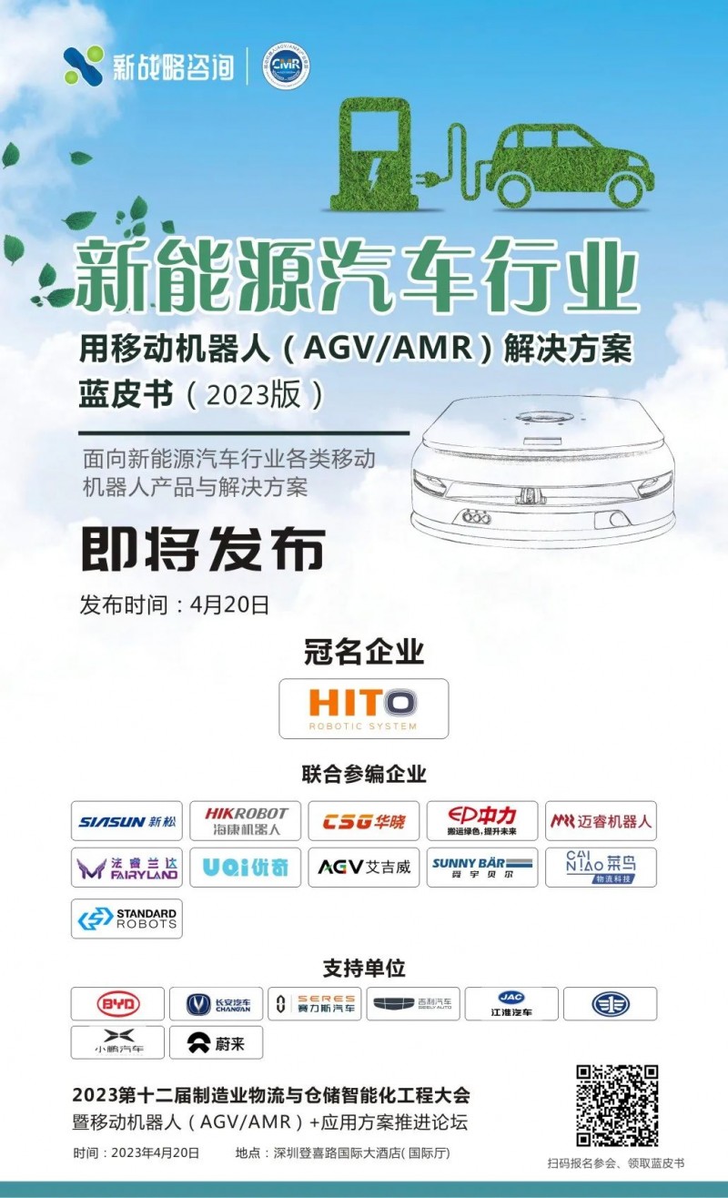 為更好地解析新能源汽車行業AGV/AMR應用現狀,4月20日,在由新戰略移動機器人以及新戰略咨詢聯合主辦的“2023第十二屆制造業物流與倉儲智能化工程大會“上,”新能源汽車行業用移動機器人(AGV/AMR)解決方案藍皮書(2023版)“將正式發布!現場參會人員可免費獲得藍皮書紙質版一份!