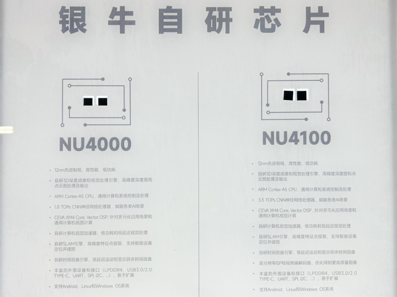 2022年成功量產(chǎn)的NU4100芯片,與NU4000相比,其深度感知及SLAM引擎保持不變,但額外集成了2路4K的ISP,并對(duì)片上AI引擎進(jìn)行了迭代升級(jí),使得其AI算力相比NU4000幾乎翻倍,能以更低成本、更低功耗的方式幫助客戶實(shí)現(xiàn)系統(tǒng)升級(jí)。正是得益于這兩項(xiàng)關(guān)鍵性技術(shù)點(diǎn)的提升,讓NU4100在越來(lái)越多的彩色圖像與3D視覺(jué)結(jié)合的場(chǎng)景中 (如無(wú)人機(jī)、3D掃描、智能制造、MR頭顯應(yīng)用等),處理起來(lái)更加得心應(yīng)手。
