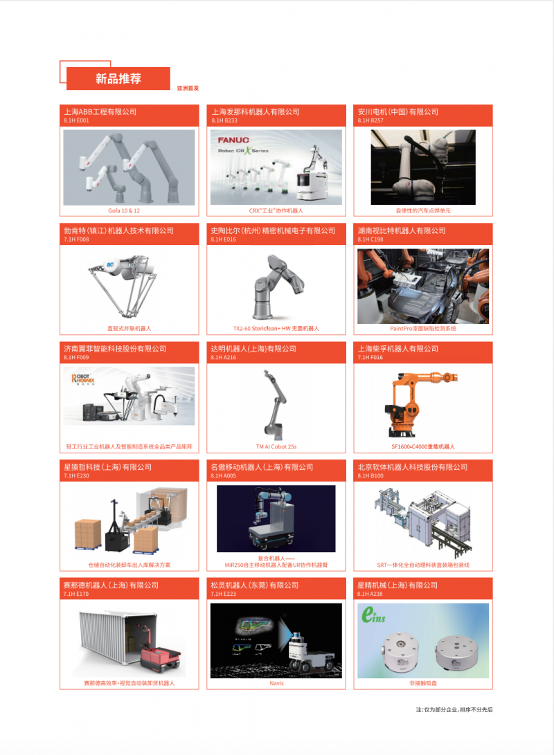 新品覆蓋了工業機器人本體、SCARA機器人、DELTA機器人、協作機器人、AGV/AMR、移動復合機器人、減速器控制器傳感器和伺服電機執行器等核心零部件、軟件及系統集成應用等,彰顯最前沿的機器人技術,為新型工業化注入新動能。