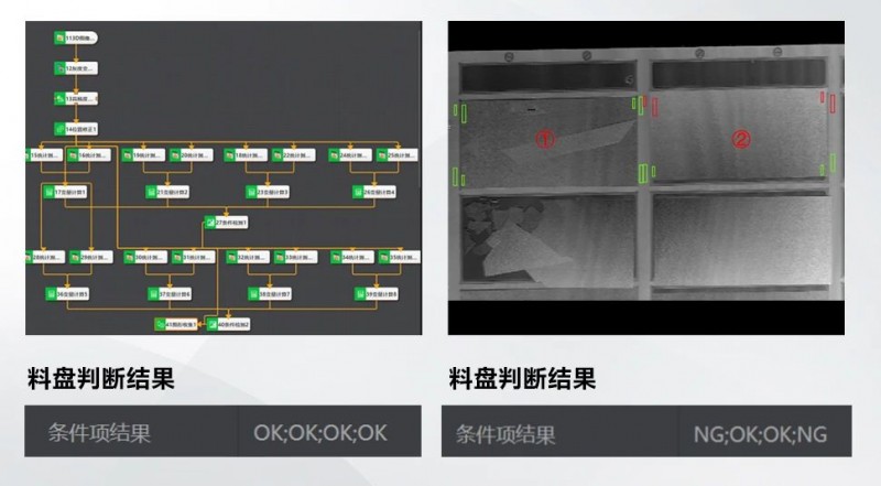 針對(duì)搭邊缺陷檢測(cè),基于相機(jī)采集的深度圖像,導(dǎo)入VM 3D軟件中,依據(jù)mark點(diǎn)定位到每個(gè)料盤的四個(gè)角點(diǎn),分別在角點(diǎn)料坑上下曲小區(qū)域計(jì)算均值,可取四對(duì)或八對(duì)區(qū)域,比對(duì)料坑上下高度差值,正值為OK(綠色非搭邊框),負(fù)值為NG(紅色搭邊框)。