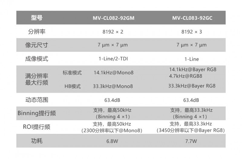 海康機器人發布新款8k千兆網接口線陣相機。新型號采用8192 × 2/3 線CMOS Sensor,7μm像元,感光性能更優,同時集成多種最新的 ISP 圖像處理技術,提供更優的成像效果。相機采用千兆網接口,植入無損壓縮技術,滿分辨率下最高行頻可達33.3kHz ,且支持 ROI/Binning 提升行頻。