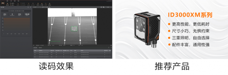 需求:電池片串焊排版后,匯流條處會(huì)貼附標(biāo)簽碼用于質(zhì)量追溯,需要透過一層毛玻璃,及一層EVA膠膜讀取,讀碼后實(shí)現(xiàn)至MES系統(tǒng)對(duì)接。