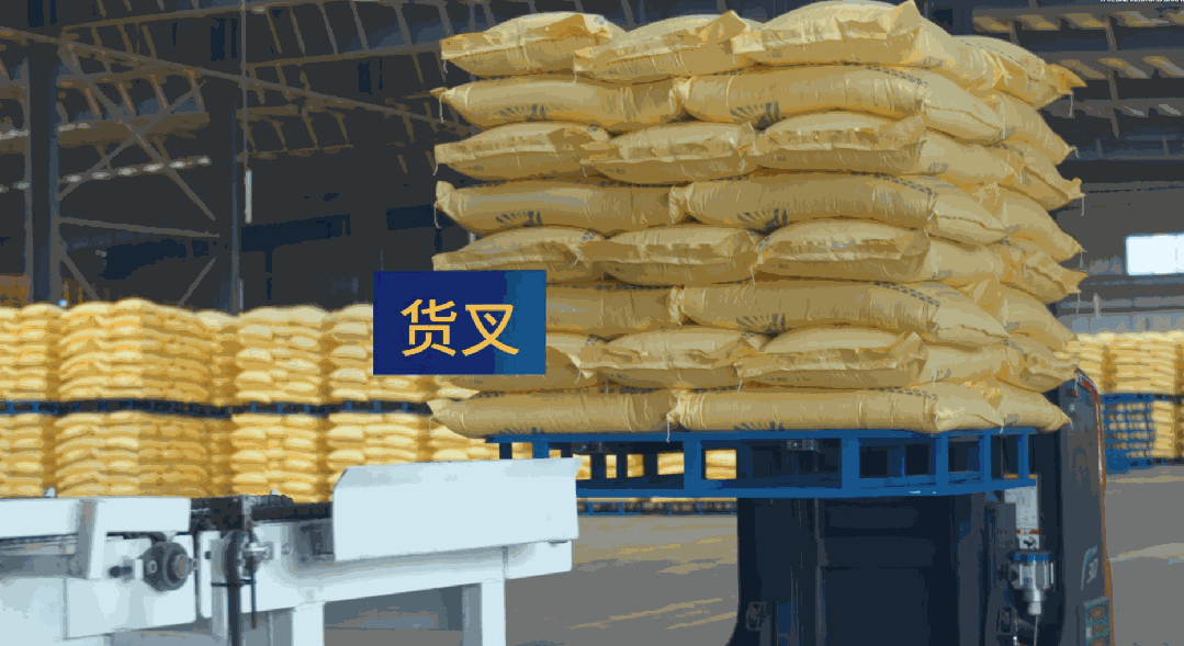 在其化肥生產制造車間的成品下線環節,目前仍采用傳統人工叉車來完成搬運任務,加之成品倉儲采用的是軟包堆疊的方式,且單垛貨物較重,直接給項目增加了一層難度: