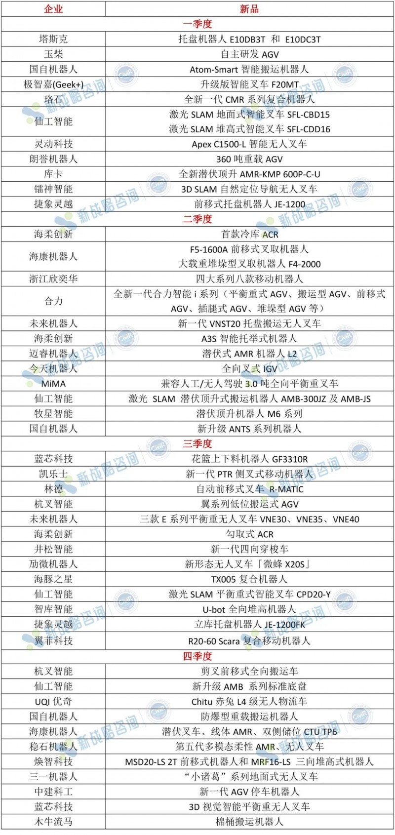 表:2023年AGV/AMR行業新產品(根據公開信息整理,如有未完善之處,請指正?。?br />