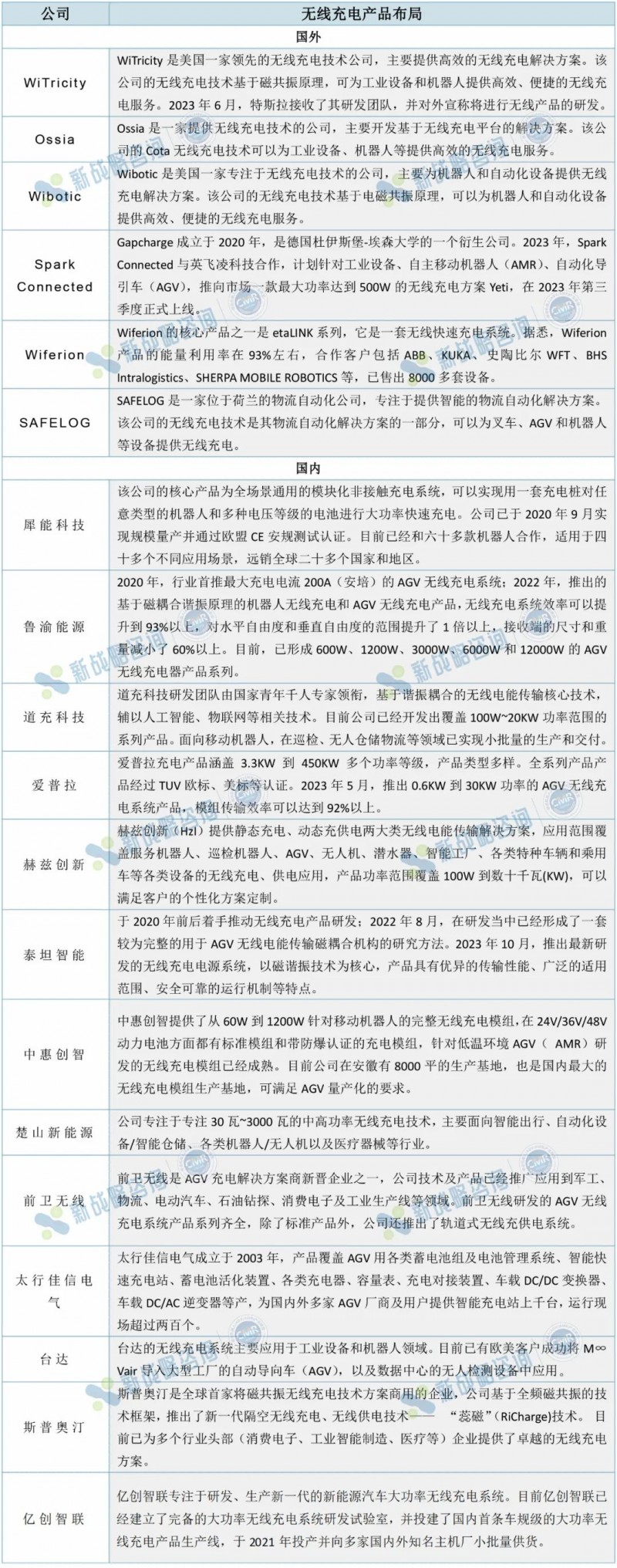 從競爭主體來看,目前國內活躍在工業制造領域的無線充電企業主要分為兩類,一類是從成立之初便耕耘于無線充電板塊的企業,以魯渝能源、犀能、道充科技等企業為代表,這類企業在無線充電領域積累了深厚的底蘊,擁有強大的技術儲備;另一類是從傳統充電機、蓄電池切入無線充電,實現雙賽道并驅的企業,以泰坦智能、愛普拉等企業為代表,這些企業對于移動機器人應用場景有著深刻理解,并擁有前期的市場優勢和資源渠道。