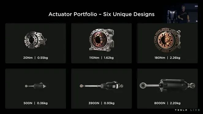 其中,有六種不同的執(zhí)行器,分別是三種旋轉(zhuǎn)執(zhí)行器和三種直線執(zhí)行器。根據(jù)特斯拉給出的數(shù)據(jù),在硬件中,旋轉(zhuǎn)執(zhí)行器占據(jù)最大的價(jià)值量。而要解決這一問題,特斯拉最好的辦法就是自己生產(chǎn)執(zhí)行器,而這又涉及到研發(fā)與設(shè)計(jì)等一系列投入。