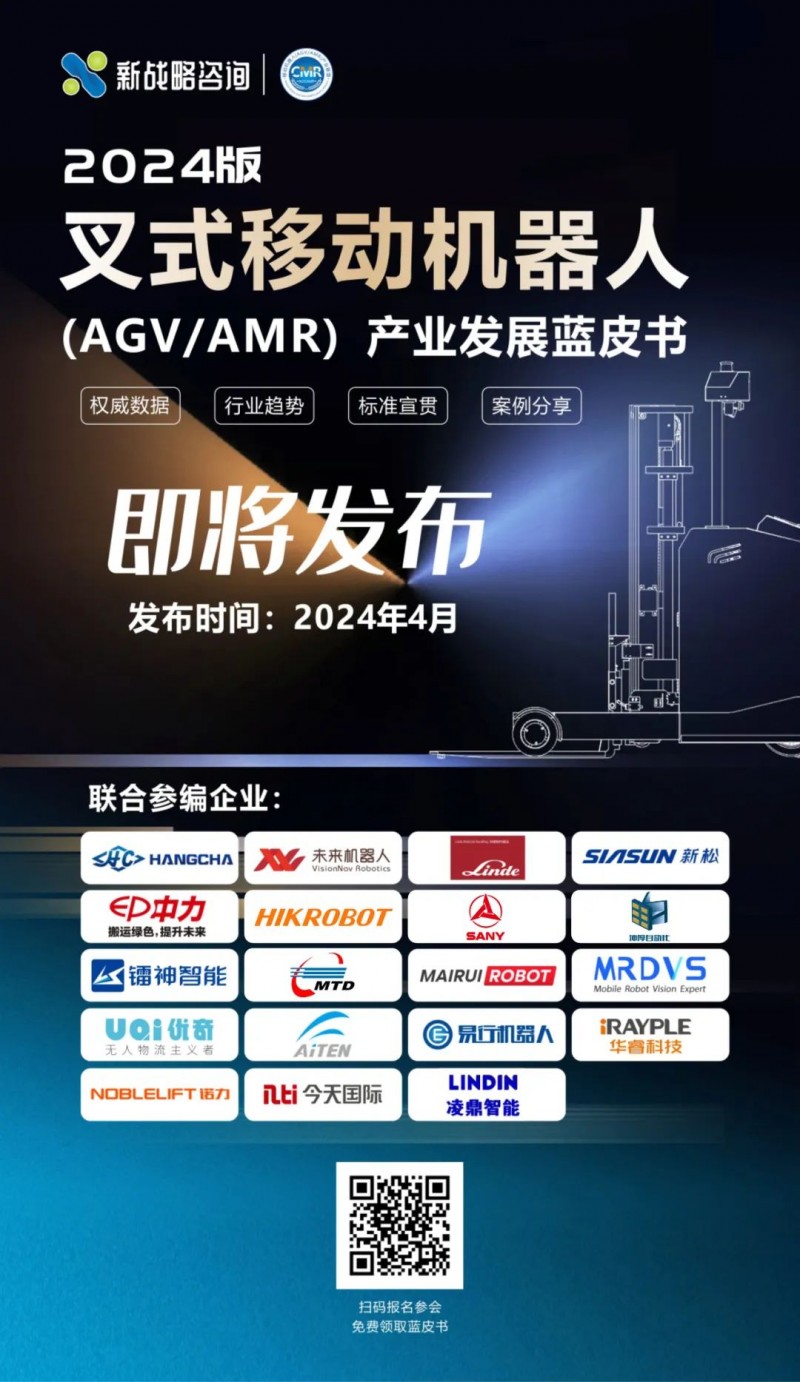 2024年,為了更好地探析當前無人叉車市場最新發展情況及趨勢,推動無人叉車深入應用,由CMR產業聯盟主編,杭叉智能、未來機器人、林德、新松、浙江中力、海康機器人、三一機器人、坤厚智能、鐳神智能、機科股份、邁睿機器人、邁爾微視、UQI優奇、海豚之星、易行機器人、華睿科技、上海諾力智能、今天國際、凌鼎智能等企業聯合參編的《叉式移動機器人(AGV/AMR)產業發展藍皮書(2024版)》將在4月29日舉辦“第二屆全球無人叉車峰會”上重磅發布,參會人員可免費獲得紙質版藍皮書一份,敬請期待!