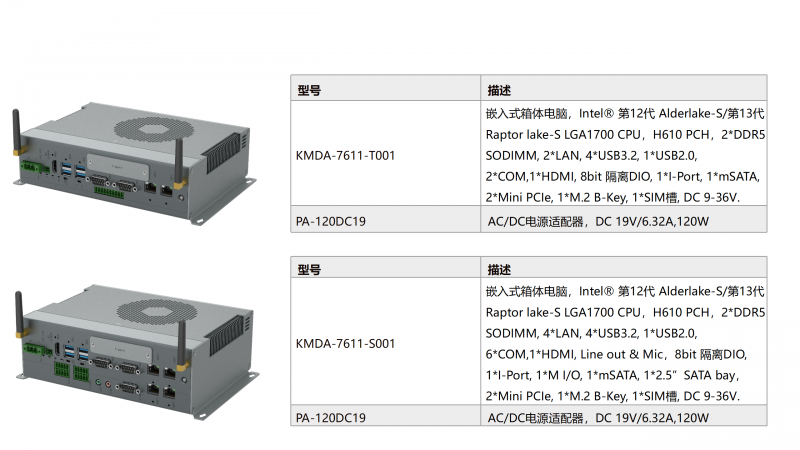 KMDA-7611是一款高性能箱體電腦,采用H610芯片組,搭載Intel®第12代Alder lake-S/第13代Raptor lake-S系列處理器,IO功能完整,體積大小適中,適用于無(wú)人叉車、機(jī)器視覺(jué)和工業(yè)控制等行業(yè)和領(lǐng)域。
