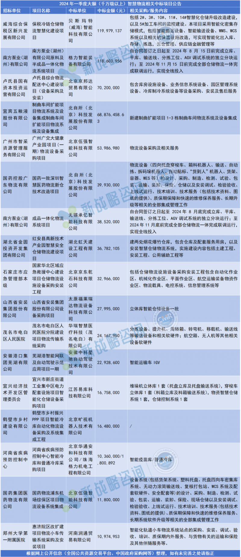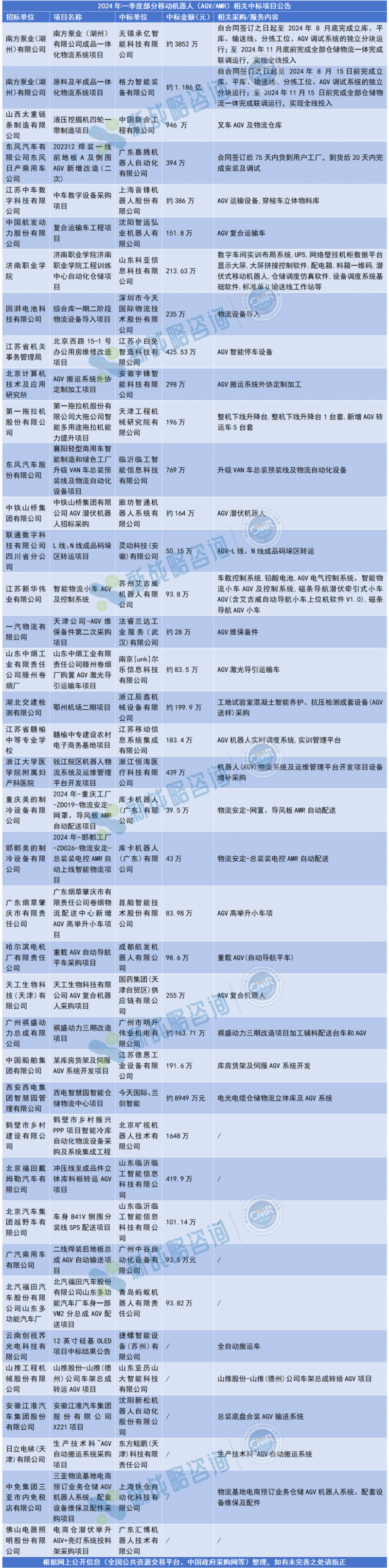 其中,一季度移動機器人領域公開發(fā)布超50項中標公告。從移動機器人領域的中標項目分布情況來看,一季度中標公告主要集中于汽車行業(yè)及工程機械行業(yè)。另據新戰(zhàn)略移動機器人產業(yè)研究所統計,汽車行業(yè)在2024年一季度釋放超十億元標的。其次是物流倉儲業(yè)。此外,醫(yī)療衛(wèi)生、電子等行業(yè)也有較多招標項目。