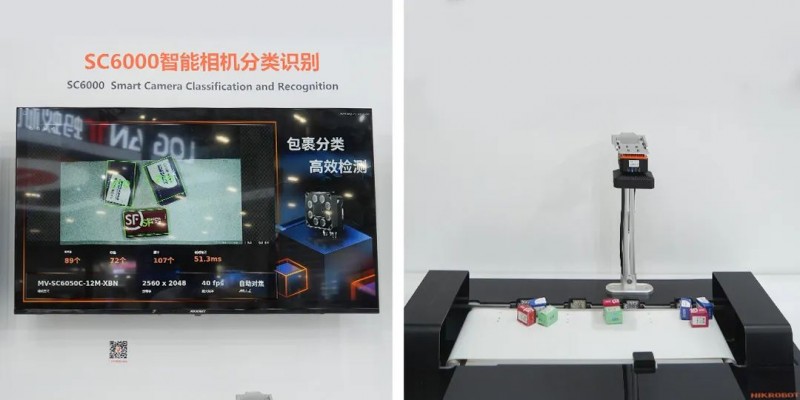 該相機采用高性能AI嵌入式平臺開發,內置VM算法開發平臺,多種通訊協議,場景適應能力強。現場展示的是SC6000對流通行業快遞包裹進行分類識別,可準確對傳送帶上不同類別包裹進行準確定位和類別分類。