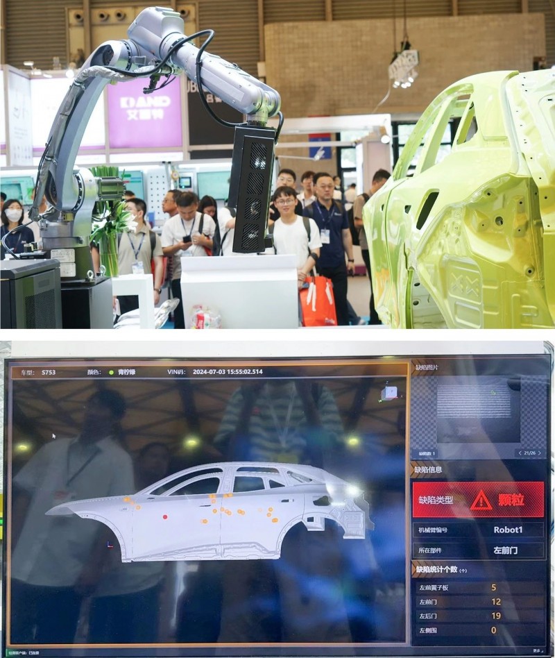 采用??禉C器人自研的程控條紋光傳感器進行采圖,對車漆表面的顆粒,漆疤、劃痕、氣泡、針眼等缺陷進行在線全檢,最小可實現0.2mm的缺陷檢測,借助機械臂的柔性,檢測可達性區域幾乎覆蓋100%車身。