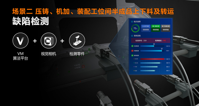 海康機器人利用工業相機,并通過VM算法平臺,實現高效缺陷檢出。對于壓鑄件,能夠檢測出凸起、缺料、多料、裂紋和碰劃傷等缺陷;在機加和裝配環節,檢測內容包括孔洞有無、通孔是否打通、螺紋孔質量、預鑄孔加工面和倒角等。