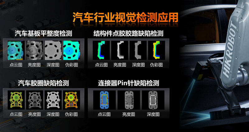 在汽車行業中,質量缺陷檢測至關重要。??禉C器人擁有成熟的產品和解決方案,可應用于多個環節,包括汽車基板平整度檢測、深度圖與點云圖的拼接,以及結構件點膠膠路缺陷檢測和連接器Pin針缺陷檢測等。