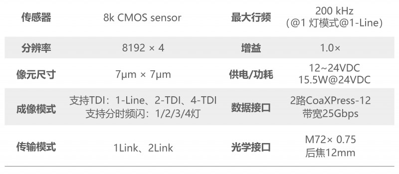 相機(jī)搭配兩路CoaXPress-12數(shù)據(jù)接口,總帶寬25Gbps,滿(mǎn)分辨率下最大行頻可達(dá)200kHz,可快速捕捉圖像,傳輸大量圖像數(shù)據(jù),匹配大部分高速檢測(cè)需求。