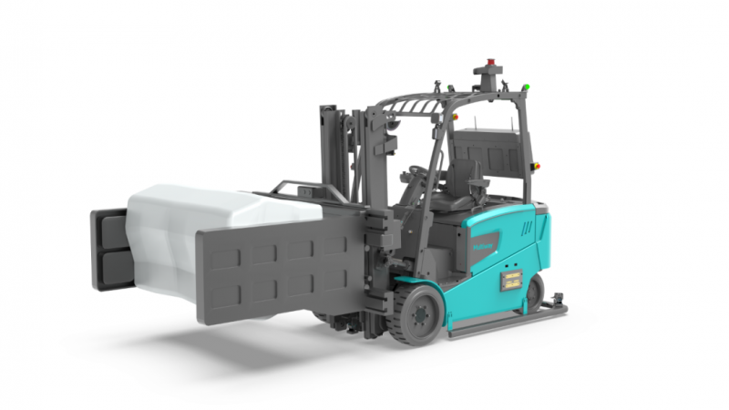 勱微E系列平衡重式無人叉車搭載弧形自適應夾具,夾緊物料后可連續360°旋轉,便于交換作業,廣泛用于造紙、紙箱、包裝、印刷等行業無托盤搬運。