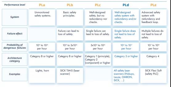 EN ISO 13849-2015標(biāo)準(zhǔn)定義了不同安全部件所需的性能級別(PLa to PLe)。行業(yè)標(biāo)準(zhǔn)要求AGV制造商達(dá)到的是PLd級別的安全規(guī)劃。具體來說,這種安全水平確保了車輛在發(fā)生單一故障時仍能繼續(xù)運行,例如使用兩個冗余通道。在斷層同步堆積的情況下,仍然可能發(fā)生安全功能的喪失,盡管這種可能性很小。