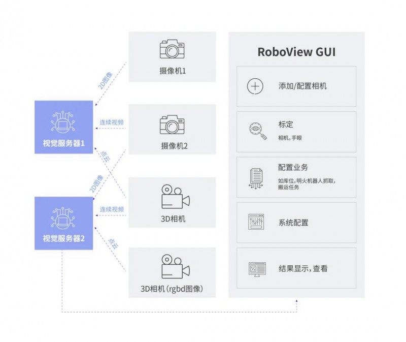 RoboView 視覺(jué) AI 解決方案以先進(jìn)的機(jī)器視覺(jué)算法為后臺(tái)(RoboView Server),以易于操作和直觀顯示的界面軟件 RoboView GUI 為前端,為客戶提供覆蓋生產(chǎn)、安全、管理等環(huán)節(jié)下的眾多應(yīng)用的視覺(jué) AI 解決方案。