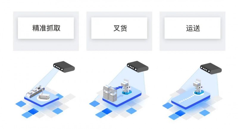 在產(chǎn)線上,RoboView Server 能夠連接多種不同類型的相機(jī),如使用激光相機(jī)拍攝視野中任意位置的貨物,對(duì)獲取到的 3D 點(diǎn)云,運(yùn)用點(diǎn)云算法識(shí)別、定位算法精確(最高可精度達(dá)到0.1mm)的計(jì)算出產(chǎn)品的位姿和外形尺寸信息,并發(fā)送給機(jī)械臂或 AGV,精準(zhǔn)抓取、 裝包或叉貨、運(yùn)送的任務(wù),或是智能引導(dǎo)涂膠等