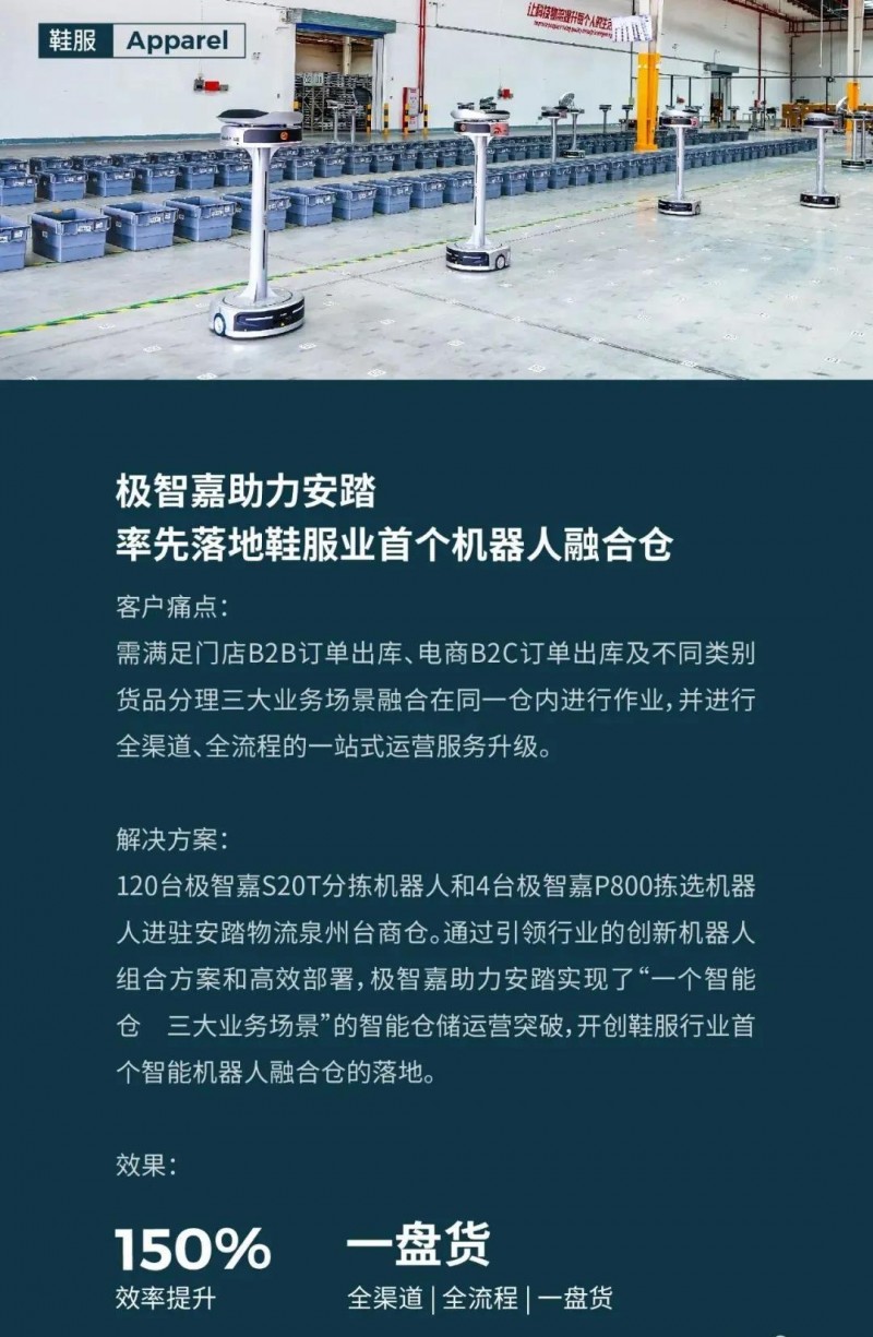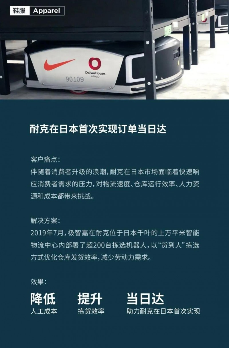 作為在鞋服行業(yè)擁有深厚行業(yè)積淀的智能物流方案專(zhuān)家,極智嘉已成功賦能耐克、安踏等行業(yè)龍頭品牌,實(shí)現(xiàn)物流智能升級(jí),不斷助力客戶(hù)以數(shù)字化、精細(xì)化的倉(cāng)配運(yùn)營(yíng)管理,連接碎片化、多邊化場(chǎng)景,提升消費(fèi)者購(gòu)物體驗(yàn)。