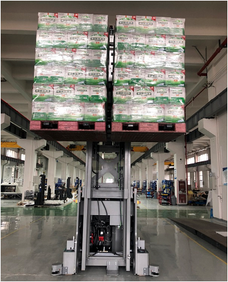 雙工位平衡重叉式AGV屬于國內首創,可同時插取兩個托盤,托盤載重可達3噸,并且其配備了3D相機識別系統,在托盤直接堆垛存儲場景中,可識別托盤對地高度,輔助判斷貨叉提升高度,實現托盤準確搬運,3層托盤直接堆垛,托盤堆垛高度可達6米左右,采用密集存儲的方式。對于百威啤酒這一類的易碎品,更加的安全可靠。