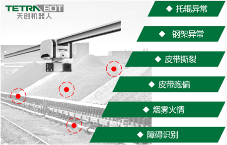 通過機(jī)器人搭載采集高清視頻圖像,利用巡檢AI算法,有效判斷皮帶跑偏,表面撕裂,路面灑落礦渣等設(shè)備故障或生產(chǎn)事故,并將告警信息及時(shí)反饋至控制中心,由工作人員及時(shí)進(jìn)行處理。