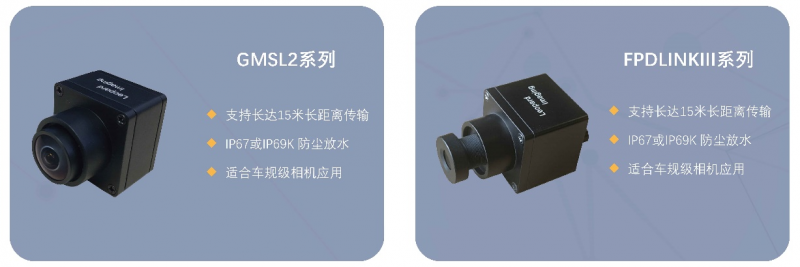 GMSL2系列和FPDlinkIII系列是為車規(guī)級(jí)相機(jī)應(yīng)用量身定制的兩個(gè)系列,涵蓋多款產(chǎn)品,提供諸如HDR、ISP、VCSEL、IR LED、立體雙目技術(shù)、3D立體成像等功能,可用于姿勢(shì)識(shí)別、虹膜掃描、增強(qiáng)現(xiàn)實(shí)、眼球跟蹤、機(jī)器視覺、IoT、機(jī)器人、位置跟蹤、生物測(cè)定、虛擬現(xiàn)實(shí)等應(yīng)用中。傳輸距離高達(dá)15米。IP防護(hù)級(jí)別一般為IP67或IP69K,可以有效防塵防水。