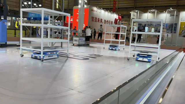 AMB-J 頂升機器人、SFL-CDD14 窄道應用自動叉車、復合機器人多臺移動機器人現場工作,專業技能同臺展示。
