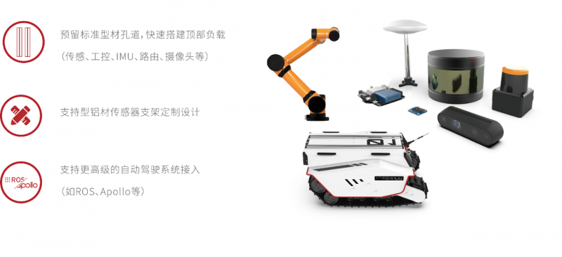 可以說,BUNKER Pro提供了在野外、箱涵、石泥路等高挑戰(zhàn)性環(huán)境下最佳的移動開發(fā)平臺,助力機(jī)器人行業(yè)和科研客戶快速部署和開發(fā)特殊作業(yè)機(jī)器人,諸如巡檢、勘探、消防、特種拍攝、特種運(yùn)輸?shù)葢?yīng)用。BUNKER Pro外觀結(jié)構(gòu)全新設(shè)計,車身重心位置低,裝置了1500W雙伺服電機(jī)進(jìn)行驅(qū)動,極具越野性。此外,其采用了克里斯蒂懸掛和瑪?shù)贍栠_(dá)四輪平衡多懸掛系統(tǒng)組合,并于全車安裝了加強(qiáng)版避震器和防撞擊結(jié)構(gòu)組件,外觀采用了高強(qiáng)度和大厚度的鋼材,這為執(zhí)行特種作業(yè)應(yīng)用提供了可靠的減震系統(tǒng)性能。 目前,BUNKER Pro最高越障可達(dá)18cm,爬坡度為<=30°,這意味著面對野外坡道和廠區(qū)樓梯,BUNKER Pro都可以一舉輕松爬越和穩(wěn)定運(yùn)行。BUNKER Pro驅(qū)動形式為履帶差速轉(zhuǎn)向和左右獨(dú)立驅(qū)動,自研運(yùn)動控制系統(tǒng)電機(jī)采用了2500線光電增量式碼盤,可以在復(fù)雜道路中實(shí)現(xiàn)高精度的控制,并且可以柔性實(shí)現(xiàn)0轉(zhuǎn)彎半徑原地自旋。BUNKER Pro外觀配置了防撞耐用的鋼質(zhì)結(jié)構(gòu), 且整車結(jié)構(gòu)、材料以及外置電氣元件均采用均采用高防護(hù)等級設(shè)計,達(dá)到了IP67安全標(biāo)準(zhǔn),這是市面上同級別綜合路況移動平臺中防護(hù)等級最高的。其具備沙塵滲透防護(hù)、移動涉水和短暫浸泡防護(hù)(防浸)等優(yōu)勢,無懼任何潮濕、涉水、越野等極限工作環(huán)境,可以保證BUNER Pro極大拓展機(jī)器人的使用場景。基于高等級防護(hù)、模塊化和精簡部件結(jié)構(gòu)設(shè)計,BUNKER Pro車體后期清潔也是十分便捷的,不藏污垢,不易腐蝕,易于維護(hù)。標(biāo)準(zhǔn)二次開發(fā)拓展應(yīng)用BUNKER Pro平臺空間大,可以在原地自旋過程中達(dá)到120kg載重,這意味著可以輕松搭載各類檢測設(shè)備。用戶可通過CAN總線協(xié)議與主控通訊,快速接入傳感系統(tǒng),搭建自主應(yīng)用開發(fā)平臺,同時,BUNKER Pro也支持定制高級操作模式(遠(yuǎn)程駕駛/自動駕駛),提供開源SDK、ROS_PACKAGE。BUNKER Pro還具有大電池容量,可在常規(guī)路面載重120kg運(yùn)行情況下支持3小時續(xù)航, 也可對搭載的傳感器等外部設(shè)備進(jìn)行供電, 為機(jī)器人應(yīng)用的作業(yè)提供充足和便捷的運(yùn)行保障。