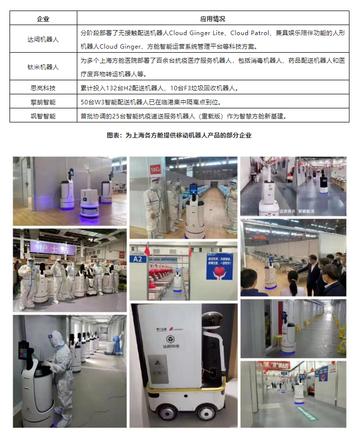 室內場景中,主要以方艙醫院等隔離收治點應用為主。本次疫情以來,上海已陸續啟用一批定點醫院和方艙醫院,其中臨港方艙應用移動機器人數量最多。