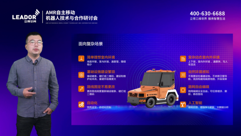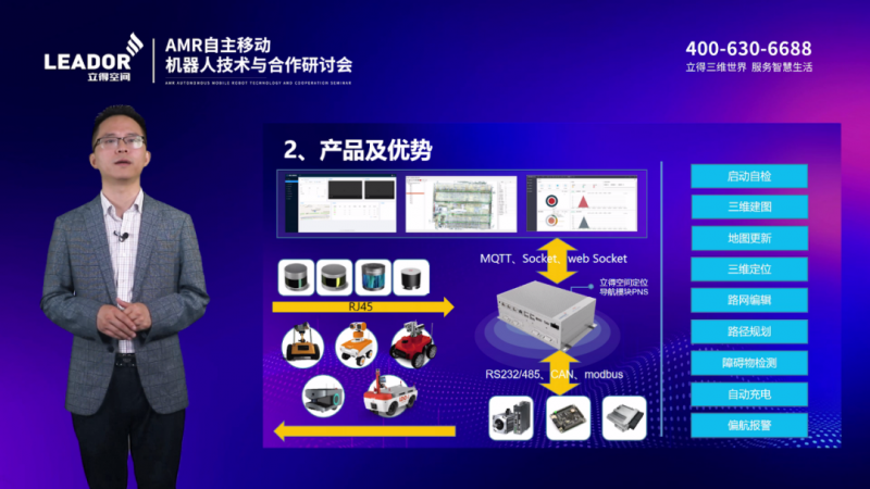 立得空間智能機(jī)器事業(yè)部銷售總經(jīng)理黃維分享了立得空間在AMR自主移動(dòng)機(jī)器人領(lǐng)域的合作案例。他指出,立得空間利用核心技術(shù)和產(chǎn)品已為數(shù)千家底盤廠家賦能。其中,核心產(chǎn)品“路霸”機(jī)器人行進(jìn)系統(tǒng)(PNS)采用3Dslam技術(shù)路線,經(jīng)過五年的迭代更新,適應(yīng)各種復(fù)雜場景,在室內(nèi)外、上下坡、高速和人車混流等場景實(shí)現(xiàn)定位導(dǎo)航,滿足不同場景下的柔性導(dǎo)航需求。